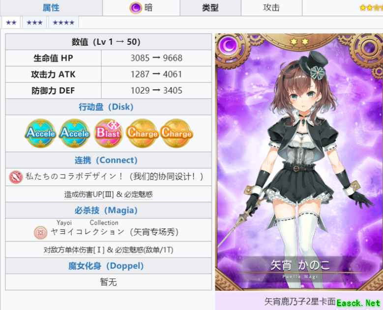 暗属性攻击型角色,盘型为AABCC,推图薄弱,但Connect必定魅惑让她和学姐组成超强搭档,无限控场,敌人动弹不得。