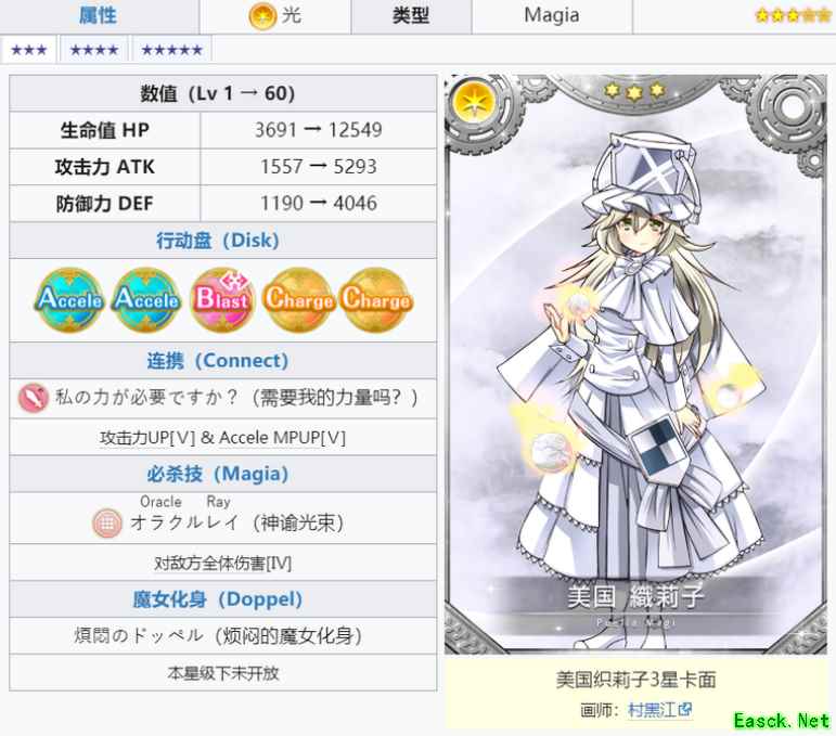 算是非洲人非常稀少的光属性输出卡,五星后的Magia又多了还拥有回避,为脆弱的身板提供了保障。