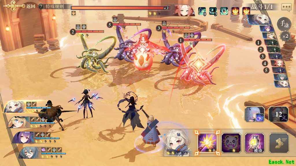 对于四到五个不吃位移的敌人来说,猫队的点杀一向是很有效的阵容,这一关的特殊规则也没有对猫队有所限制,因此优先点杀两只绿色的触手怪,然后正常打基本就能顺利通关了。