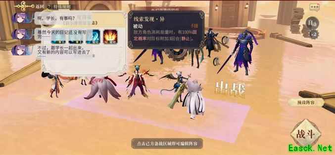 战斗思路大致如下:开局用援护抱朴子群控怪物给小怪触发易伤,4个人群体释放技能清掉小怪、打残主怪,队伍尾速在放技能前用卡门清除离BOSS最近的幻书身上的控制效果,第二轮集火主怪结束战斗。