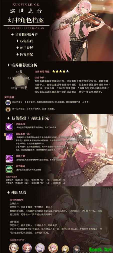 首位典藏稀有度的精研幻书,可长期处于援护位发光发热。职能大致与套中人、安徒生童话等套盾幻书相似,但是巡音更注重于辅助BUFF的附加,可以当做一个BUFF机来使用。S的攻击与成长与被动的高比例攻击加成让巡音具备一定的攻击能力,是个不错的辅助选手。