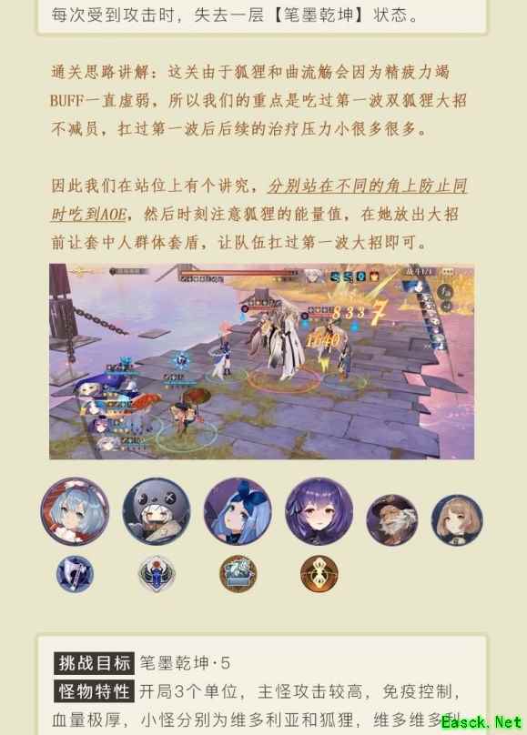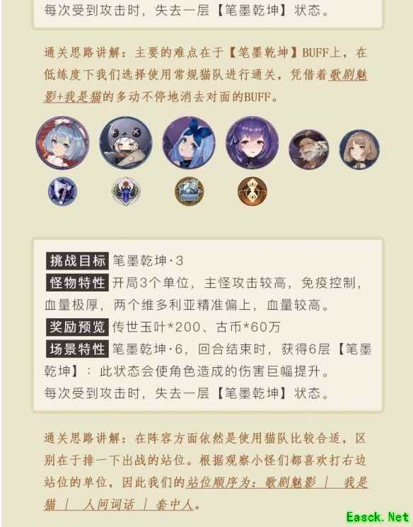 在过关的时候,主要要留意的是三只怪身上的【笔墨乾坤】BUFF,必要时刻甚至需要计算当前回合出手中能否将BUFF清完,基本上开局稳定住局面后,后面就比较简单了。