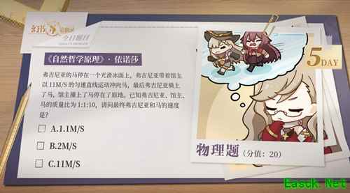 今天的出题人是《自然哲学原理》·依诺莎,这是一道需要思考的物理题哦——弗吉尼亚的马停在一个光滑冰面上,弗吉尼亚带着馆主以11M/S的匀速直线运动冲向马,最后弗吉尼亚骑上了马,馆主撞上了马停在原地。已知弗吉尼亚、馆主、马的质量比为1:1:10,请问最终弗吉尼亚和马的速度是以下哪个答案?