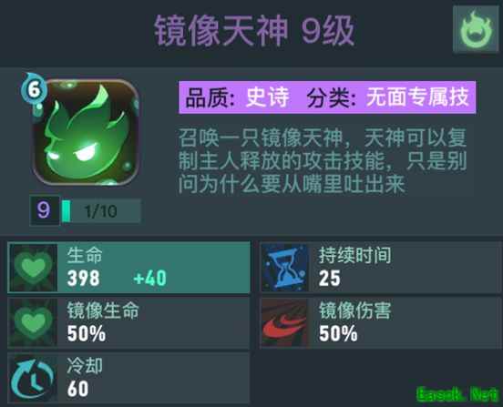 此技能可以配合技能“镜像天神“。天神可以理解为无面专属的技能镜像,再搭配上“技能镜像“这个传说技能,只要能量够一波不是梦。