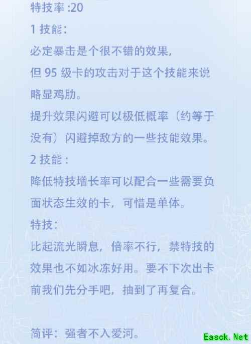 这张卡怎么说呢,本质上就是花瓶,具体的技能特技如图所示,如果非要在它跟白城还有旅途之间选一个养的话那还是建议养它。