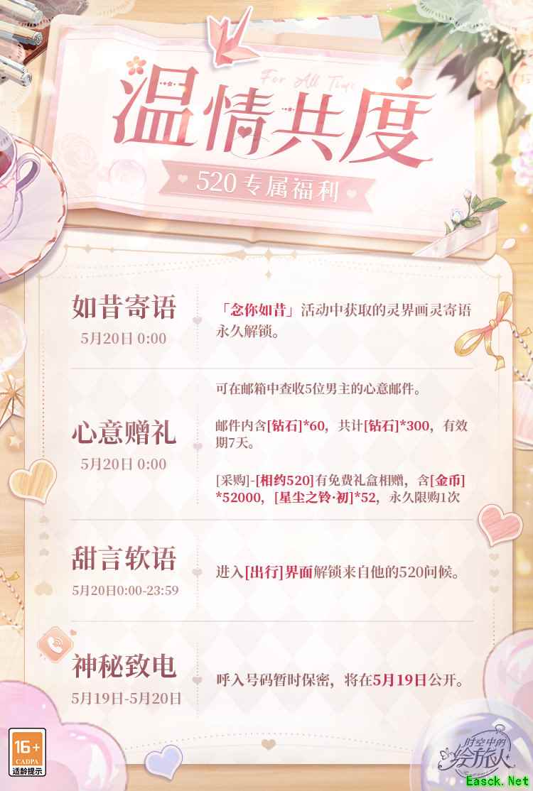 5月20日 00:00后,可在邮箱中查收5位男主的心意邮件。邮件内含[钻石]*60,共计[钻石]*300,有效期7天。