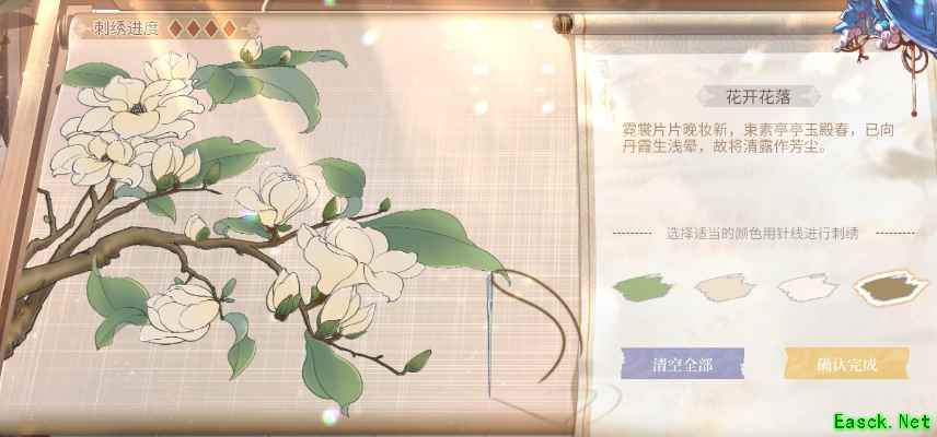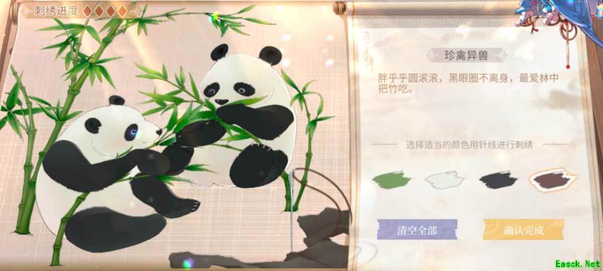路辰的刺绣与艾因的脸谱填色类似,路辰的填色同样是有4步,需要在对应区域完成填色。刺绣相同,需要玩家选择对应颜色的绣线,然后挪动绣针到指定位置。在完成填色后就可以点右下角的完成即可。