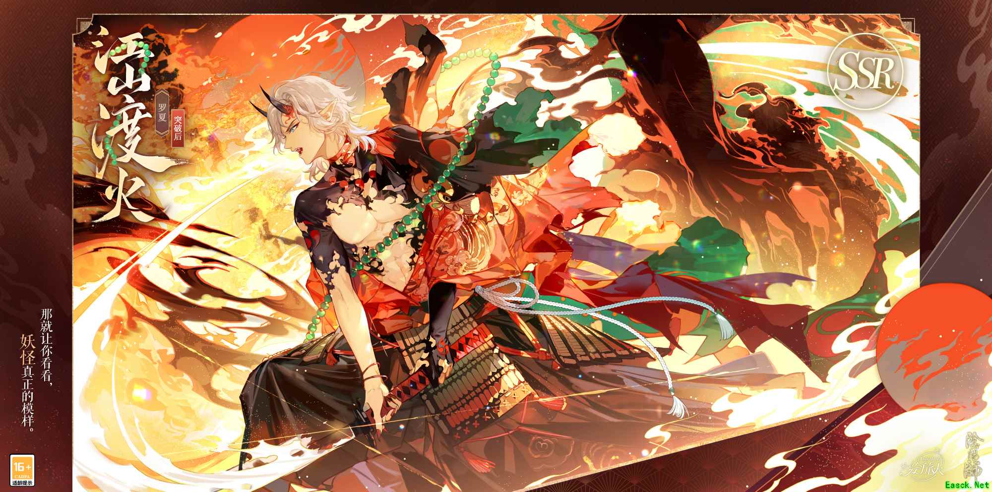 SSR画灵[江山渡火]属特殊联动画灵,具备获取时台词特别展示;突破后具备横幅卡面、[流光]效果,可设为登录界面。