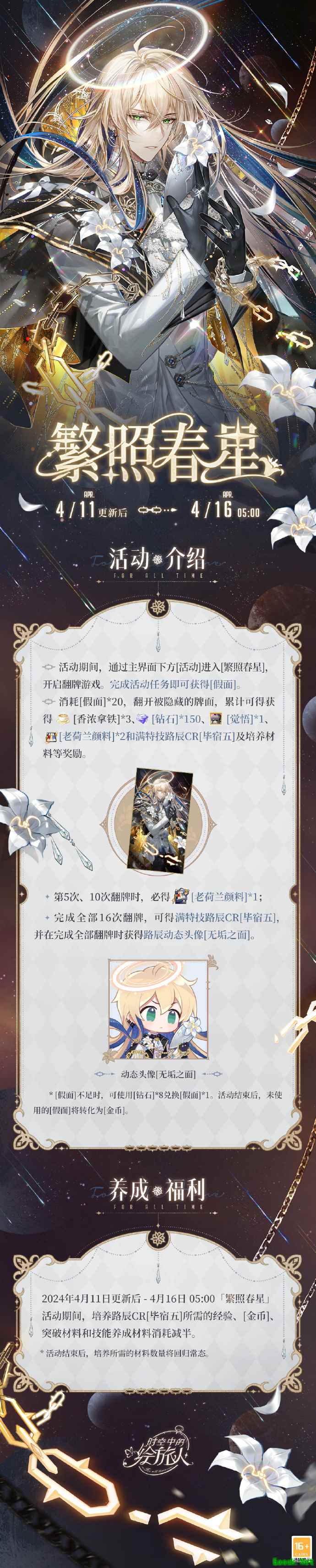 4月11日更新后 - 4月16日05:00,通过主界面下方[活动]进入「繁照春星」。完成活动任务或购买礼包获取[假面],消耗[假面]翻开被隐藏的牌面,可得[钻石]、[觉悟]、[老荷兰颜料]和路辰CR[毕宿五]等奖励。