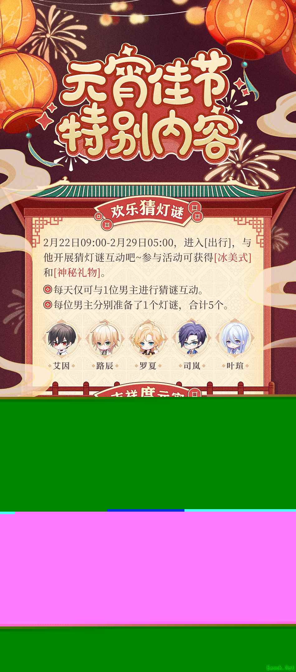 * 每天仅可与1位男主进行猜谜互动。每位男主分别准备了1个灯谜,合计5个。