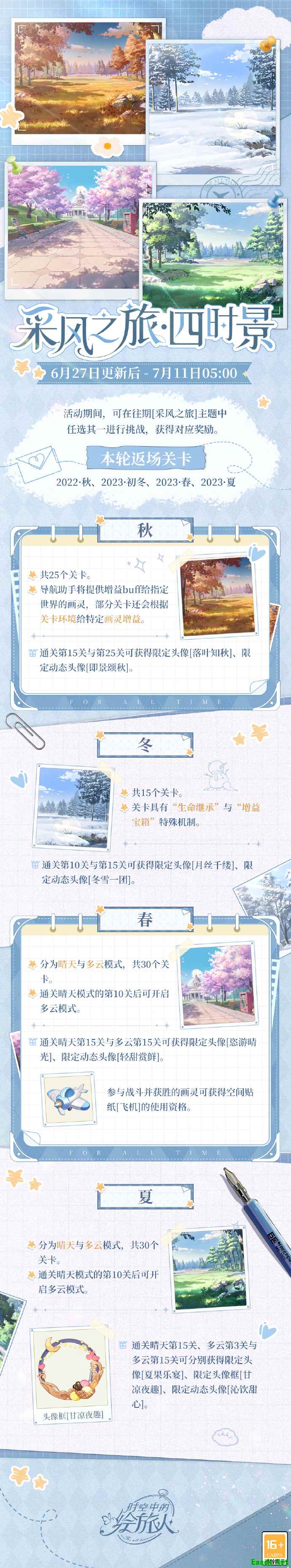 6月27日更新后 - 7月11日05:00,「采风之旅·四时景」正式开启。本次采风为往期[采风之旅]主题返场,任选其一进行挑战,可得对应期数往期奖励。