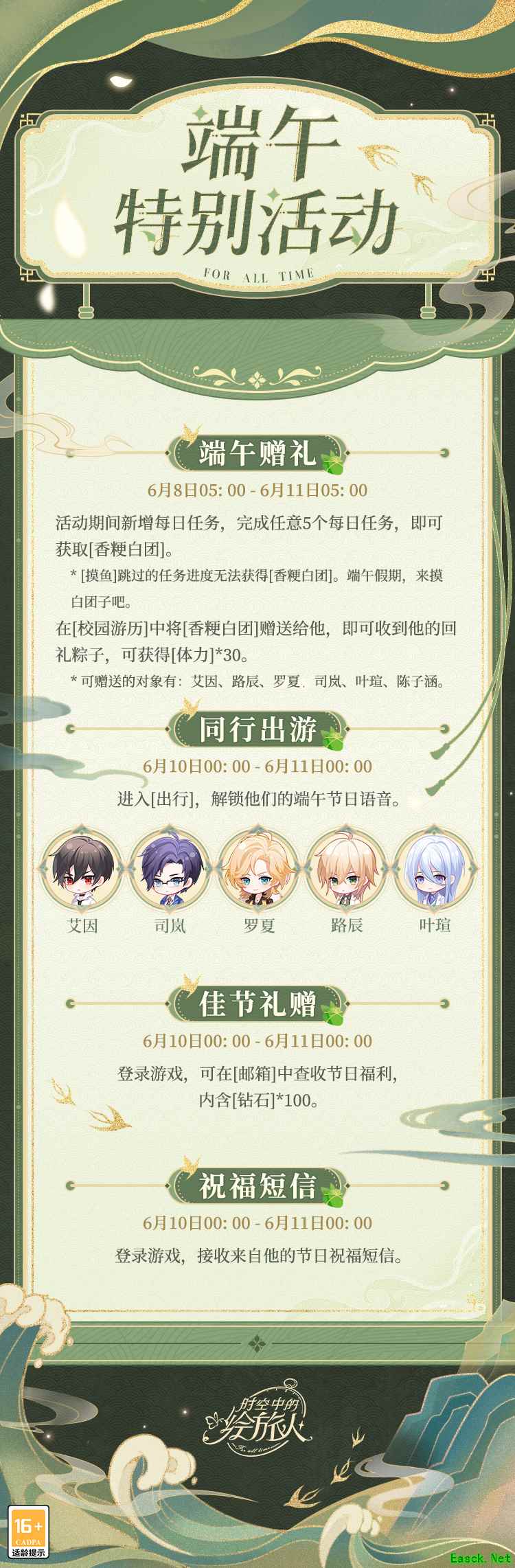 ► 祝福短信:6月10日00: 00 - 6月11日00: 00,登录游戏,查收他的端午节日短信。