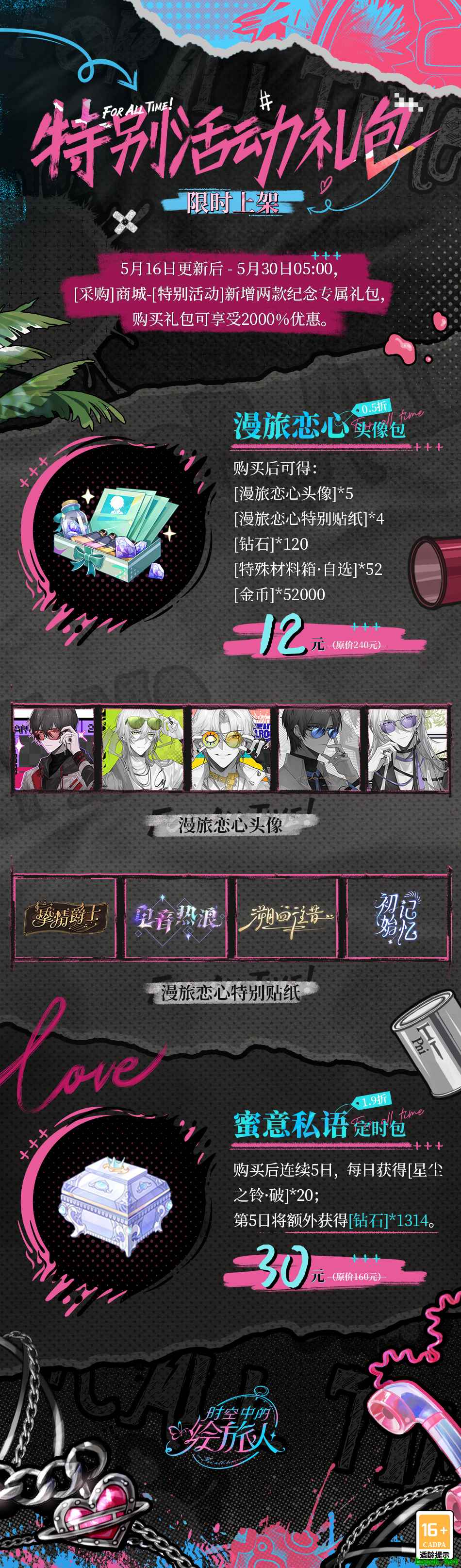 5月16日更新后 - 5月30日05:00,[采购]-[特别活动]新增[漫旅恋心头像包]、[蜜意私语定时包]两款纪念专属礼包,购买享受2000%优惠。