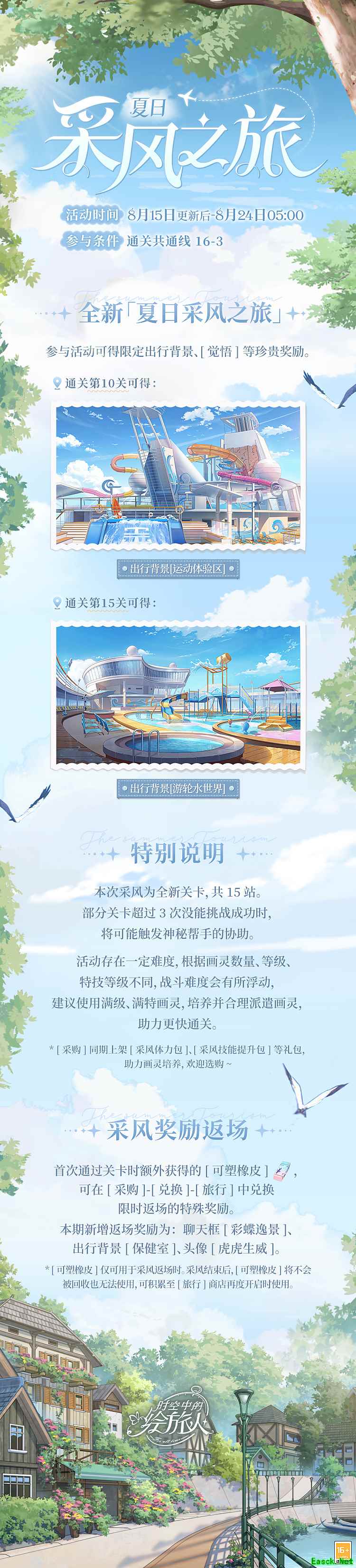 8月15日更新后 - 8月24日05:00,全新「夏日采风之旅」正式开启,参与活动可得出行背景、[觉悟]等珍贵奖励。