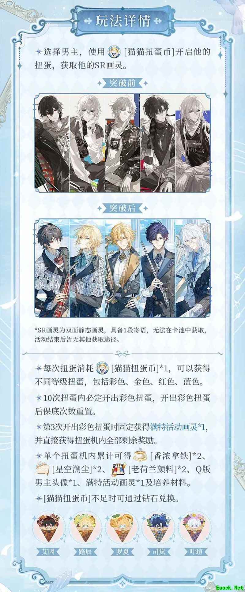 ►10次扭蛋内必定开出彩色扭蛋,第3次彩色扭蛋的奖励固定为对应男主的满特SR画灵,同时可直接带走扭蛋机内全部剩余奖励。