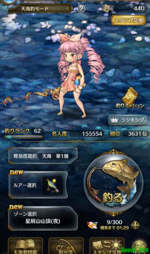 右上为钓鱼点数,可在交换可以换取材料或者钓鱼属性。钓鱼体力可以用海晶石回复(氪金佬的选择)