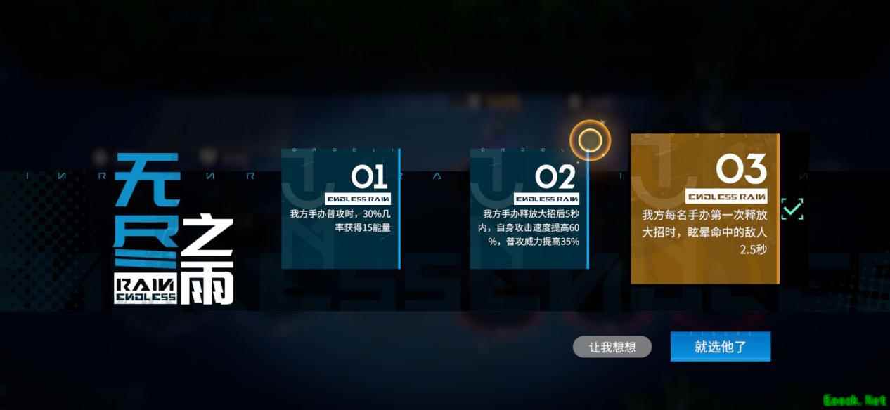 遇到难度比较大的精英关卡,小伙伴们可以根据自己队伍的肉盾和火力角色的特点,选择强化肉盾,或强化输出的雨夜buff,如果战斗失败,也没有关系,可换一个buff以重新再来一场试试。