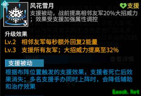 海伦支援被动可以战前提高相邻友军大招威力,适合围绕海伦组建大招流派,其效果受支援加强属性调控。被动升级后,相邻友军每秒额外回能增加,相比大招的瞬间回能可能会能量回复过剩的情况,每秒回能效果更稳定,能进一步提高大招流输出手办的大招启动速度和释放频率。被动升到3级后,可支援所有友军,布阵灵活性大增。