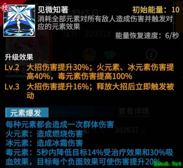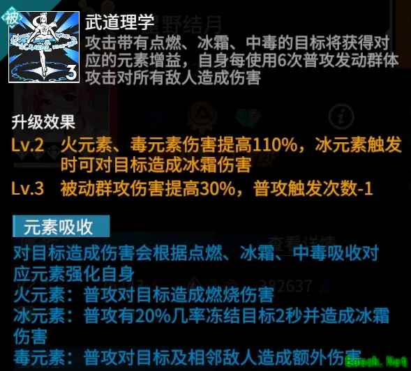 星野结月攻击带有点燃、冰霜、中毒状态的目标会获得对应的元素增益,每种元素都会强化她的普攻和大招。