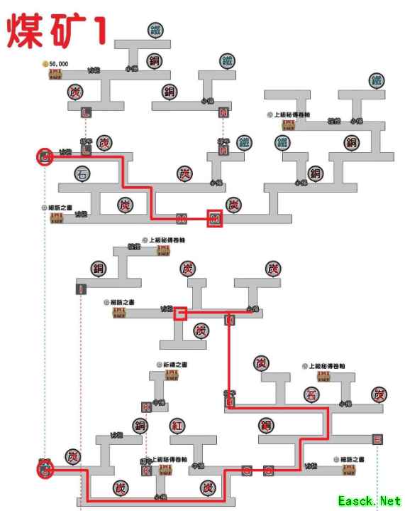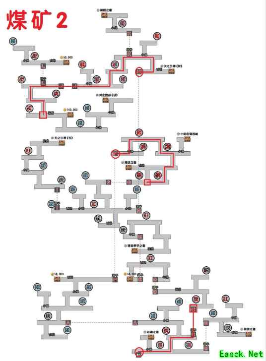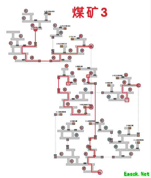 圆圈是矿车起点,方块是传送回村庄,打叉是采集的矿,因为上下移动几乎不会遇敌,所以路线省略了沿途上下移动的路线。