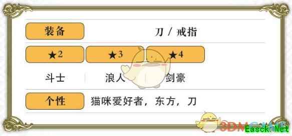 来自东方某家小神社的少女。那家神社敬奉着古老的猫神,她深信自己是那位猫神的转世。为了传扬猫神的威光,她千里迢迢来到了这片大陆上,但成绩似乎普普通通。性格任性,容易得意忘形,但喜欢积极地帮助别人。