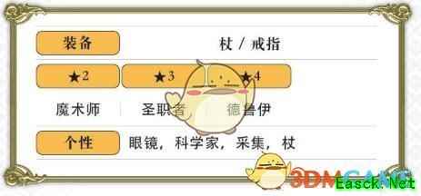 埃尔吉昂医学院所属研究员。是调配药剂的专家,接二连三地创造出效果诡异的新药。本人信奉恋爱至上,研究出“终极一见钟情之药”是她的毕生事业。为了达到自己的目的,会擅自把同伴当作小白鼠。