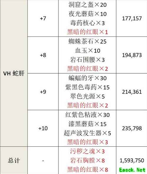 这图是强化一把降魔装备到+10所需的素材数量以及金币,其中标红的是精英怪的素材,可以看到强化满一把+10需要1,593,750金币,自己金币不是很多的,掂量好应该强化哪件装备。