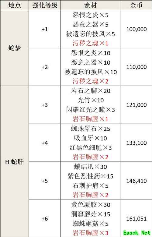 注意:降魔装备+2前需要的素材一致,+3开始,每件装备每个等级强化时需要的小材料会有些许差异,但数量上都是一致的(比如项链+10需要 红紫色粘液x30,手镯+10则是需要 蝙蝠的牙x30),该图是以降魔项链举例。