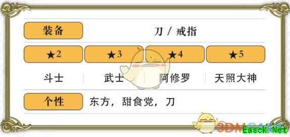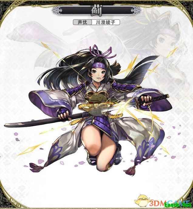 来自东方某个国度的女武士。为了在将来承担起保护主君公主的重任,特地远渡重洋,修炼武艺。虽然平时的言行举止中充满武士气概,但她内心其实和同龄的女孩一样。有时一不小心就会在无意中露出真实的一面。