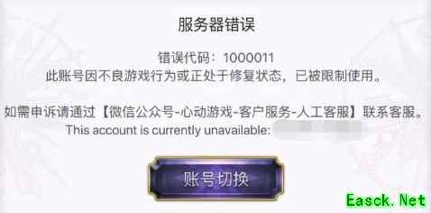 在账号修复过程中,可能会出现错误代码:1000011提示(如图所示),此时我们正在修复您的账号,请稍后再登录游戏即可。