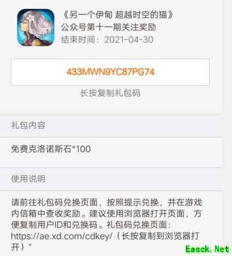 以上就是小编整理的关于《另一个伊甸:超越时空的猫》公众号11期关注礼包兑换码的全部内容,更多游戏攻略请持续关注手游网!