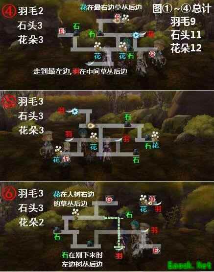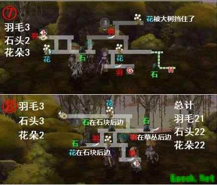 全图羽毛一共有21个,石头22个,花朵22个大家可以对照位置找三种物品!