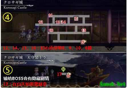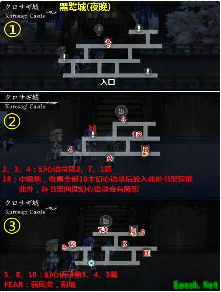 宝箱:1~18,其中2~5、8、10、12、14~16是幻心语录(共10本),全收集后放入18处的书架,可获得中级地。17要在打完BOSS后从白天的黑鹭城去到这里拿。