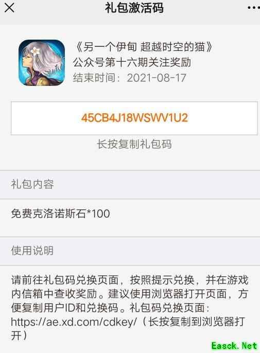 以上就是小编整理的关于《另一个伊甸:超越时空的猫》微信公众号16期关注礼包兑换码的全部内容,更多游戏攻略请持续关注手游网!