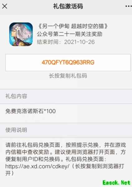 《另一个伊甸:超越时空的猫》官方会不定时的发布一些福利,例如兑换码。在微信公众号上,每两周出一期兑换码,公众号21期礼包兑换码是什么呢?这次同样有100免费克洛诺斯石哦!下面小编给大家带来的《另一个伊甸》微信公众号21期礼包兑换码分享,感兴趣的小伙伴们一起来领取吧。
