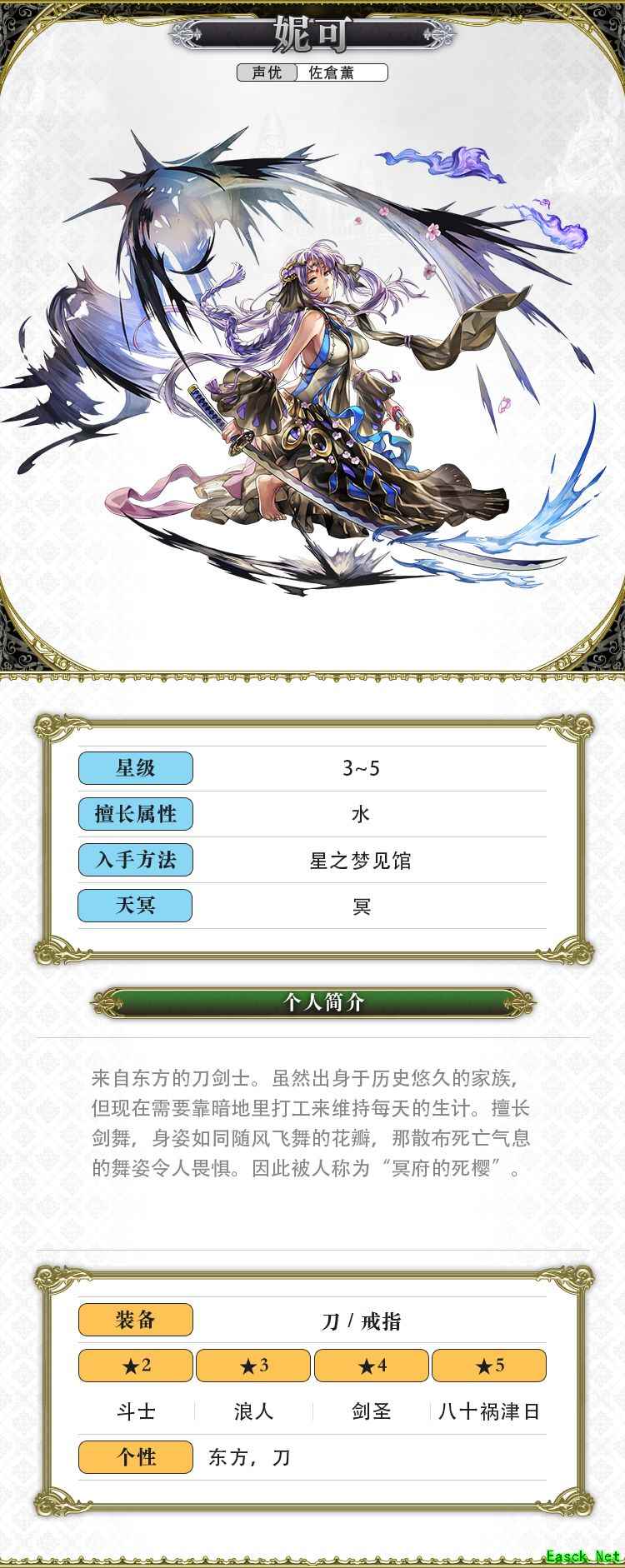 给予单一敌人3次水属性斩攻击(中)+力量10%DOWN+智力10%DOWN(2回合最多可累积3次)+自身累积死樱花瓣。对象处于受伤状态时技能威力增加,根据死樱花瓣的累积数值提升效果