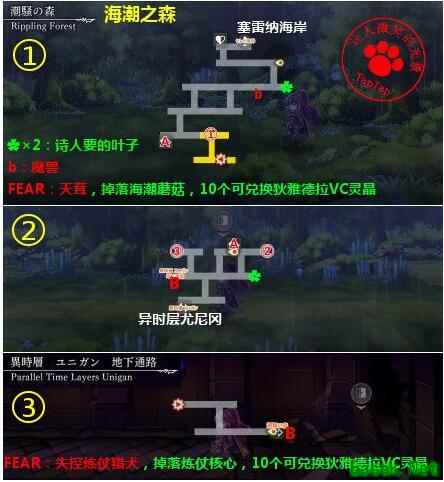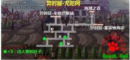 ⑦诗人:白天林德。在异时层找10片叶子给他,其中海潮之森2片,塞雷纳海岸2片,尤尼冈3片,圣骑士村3片,位置见地图