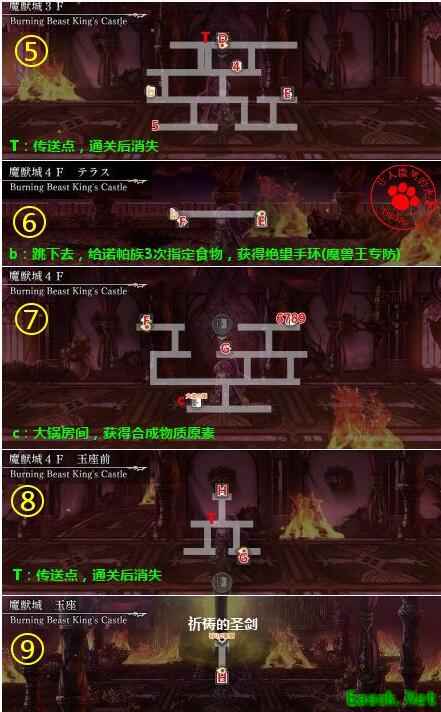 ②燃烧魔兽城4楼露台,最左边跳下去,给诺帕族3次指定食物(将沙漠塔外传赠送的角色诺帕族编入队伍才能听懂食物信息),可得到绝望手环(魔兽王专防),Lv10强化效果:伤害UP(+40%×死亡队友数),强化素材:海潮之森、异时层塞雷纳海岸。食物信息详见待发布,或文末