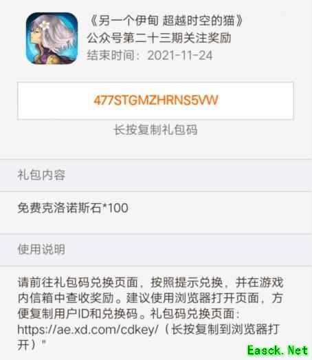 备注:这是小编领到的兑换码,大家的可能不一样,大家可以去关注公众号,点击菜单-伊甸有礼-当期礼包,即可复制自己的专属礼包激活码。