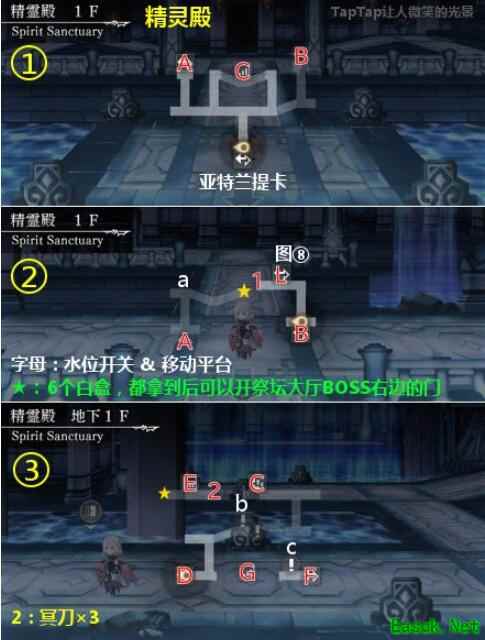 入口→A→a→白盒(图②)→A→C→b→D→白盒(图④左)→E→白盒(图③)&宝箱2→E→F→c→F→白盒(图④右)&宝箱4→F→G→d→白盒(图⑤)→H→宝箱7→H→f×2→g1→g2→I→宝箱8→I→g3→d→J→h1→i→h2→i→h3→j→k1→m(瀑布开关)→k2→k1→宝箱12→j→k1→n→白盒(图⑧)→L→L→K→BOSS→宝箱13(纪录大厅右边)→通关后重新回到图⑨,如果6个白盒都收集齐了,可以进入N,拿宝箱14和15,以及人工精灵探测器