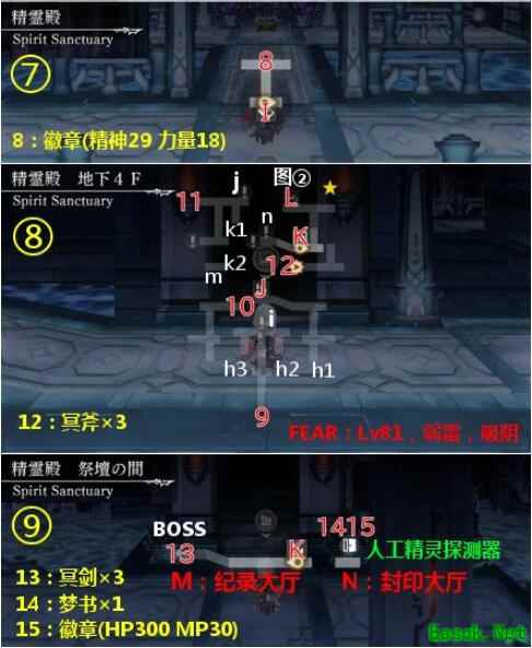 宝箱:1~15,其中2是冥刀×3,4是冥拳×3,7是徽章(幸运29 智慧18),8是徽章(精神29 力量18),12是冥斧×3,13是冥剑×3,14是梦书×1,15是徽章(HP300 MP30)