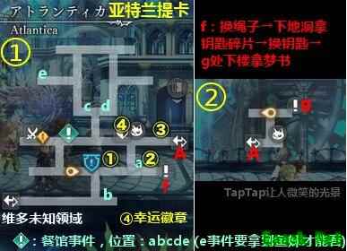②餐馆事件:调查亚特兰提卡5个闪光处abcde,即可在酒馆观看5个特殊剧情,每个剧情给5石,其中左下的剧情必须有鱼妹才能看 (正因如此我才完成了钓鱼)