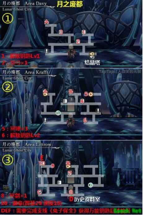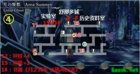 1~16,其中1是解除钥匙Lv1,2是冥弓×1,5是冥锤×3,6是解除钥匙Lv2,8是冥剑×1(完成支线《兔子保全》后),10是徽章(智慧29 速度18)(完成支线《兔子保全》后),12是冥杖×4,15是冥枪×2,16是书籍《月之青年 炎热河口湾》(实验室右边闪光)