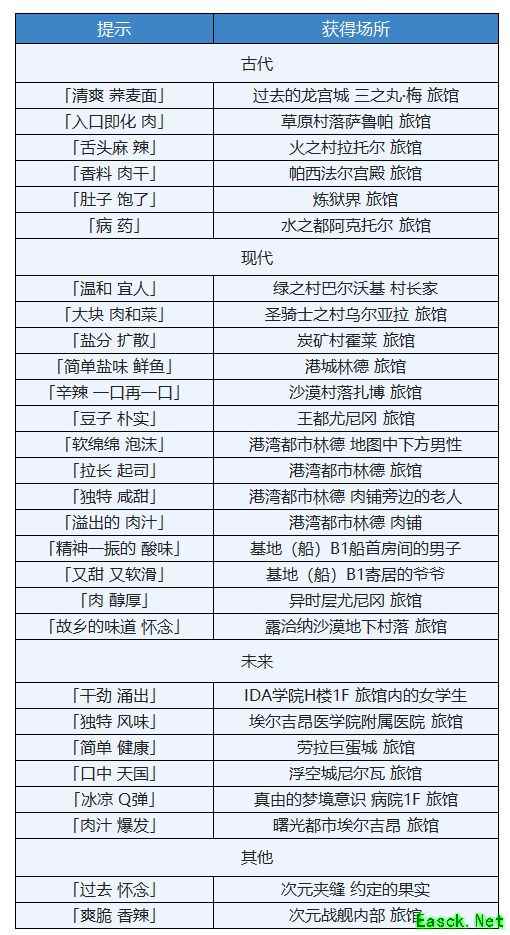 ※每个玩家获取的提示是随机的,答案见下表。