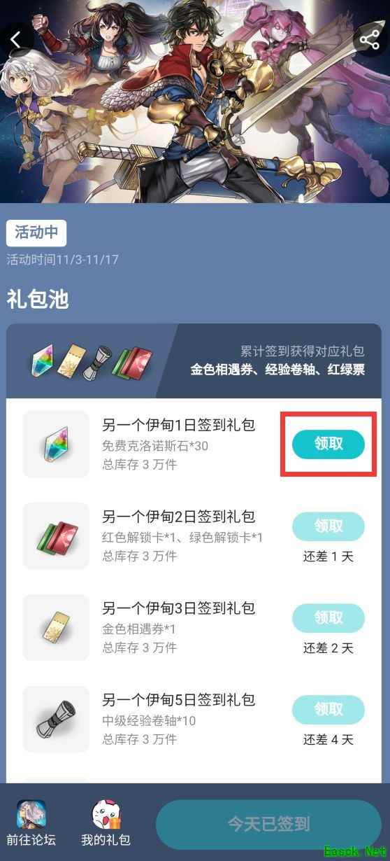 在一周年签到活动页面(需在TapTap打开)累计签到即可获得对应天数的礼包~