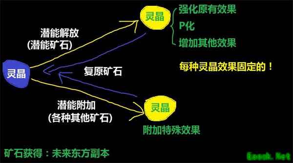 ②潜能附加:使用一个特殊矿石(有各种类型,如增加对光景的好感度,增加暴击率,增加魔法暴击率,免死,消耗MP但提升攻击,敌人数量越多伤害越高,AF外增伤,弱点时增伤,等等),例如对光景的好感度+9的矿石,潜能附加这个矿石之后这个灵晶就增加了对光景的好感度+9这一效果(好感度提升会影响光属性攻击和光合作用效果)。
