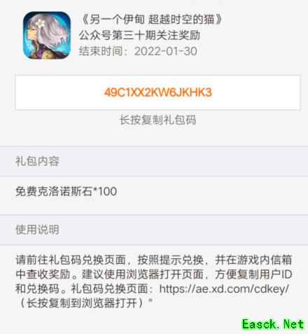 以上就是小编整理的关于《另一个伊甸:超越时空的猫》微信公众号30期礼包兑换码的全部内容,更多游戏攻略请持续关注手游网!
