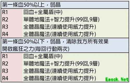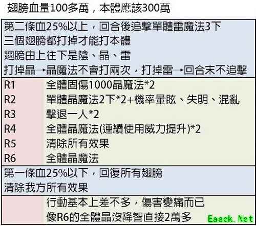 1、3对翅膀分别弱雷阴晶,耐其他,翅膀打完了才能打本体,本体弱晶,锁血25%,锁血后重新生成3对翅膀,并清除我方(DE)BUFF。
