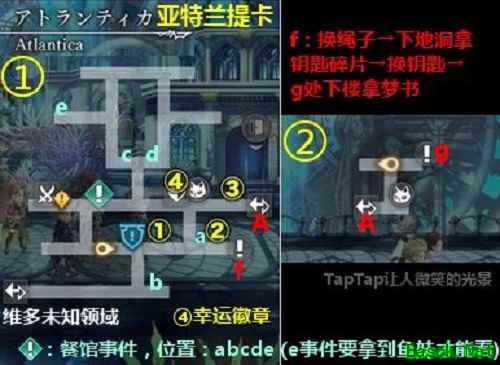 ④餐馆事件:调查亚特兰提卡5个闪光处abcde,即可在酒馆观看5个特殊剧情,每个剧情给5石,其中左下的剧情必须有鱼妹才能看 (正因如此我才完成了钓鱼)。