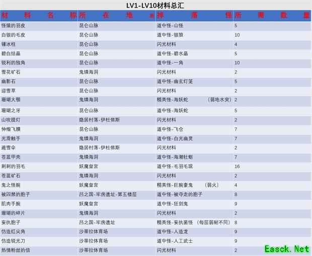 ↑↑上图为强化1-10所需全部材料和材料地址,需要注意的是昆仑山脉要从雪村向右走,沙蒂拉体育场怪物材料要从 次元夹缝的记忆之殿进去。